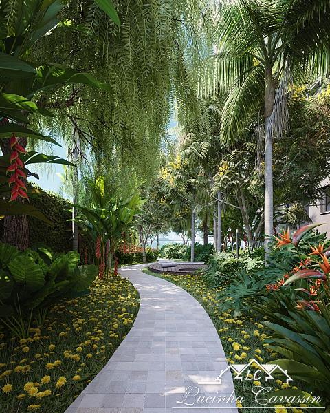 • Jardim com plantas, flores e árvores